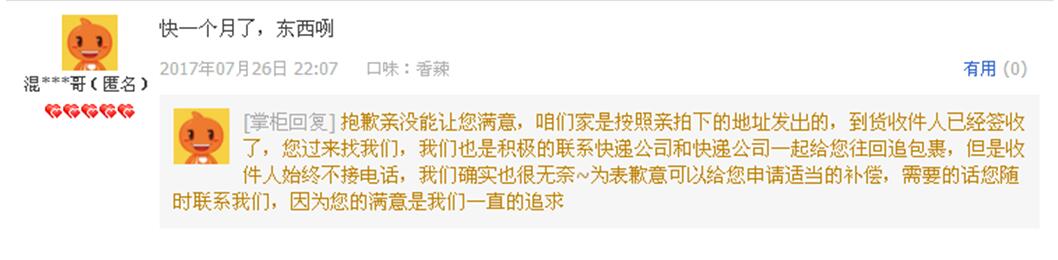 这是一个关于“丢件”,最后导致差评的案例。顾客反映“丢件”了,卖家首先做的是:道歉,其次又把他们跟踪包裹,解决问题的环节在“回评解释”里做了描述,表明为这事,他们确实有跟快递公司沟通。最后,虽然是按照顾客留下的地址发货,快递公司反馈收件人也签收了。按理说跟卖家已经没有关系了,但是为了让后来看产品的“潜在顾客”放心的购买,卖家提出:“给予适当的补偿”。